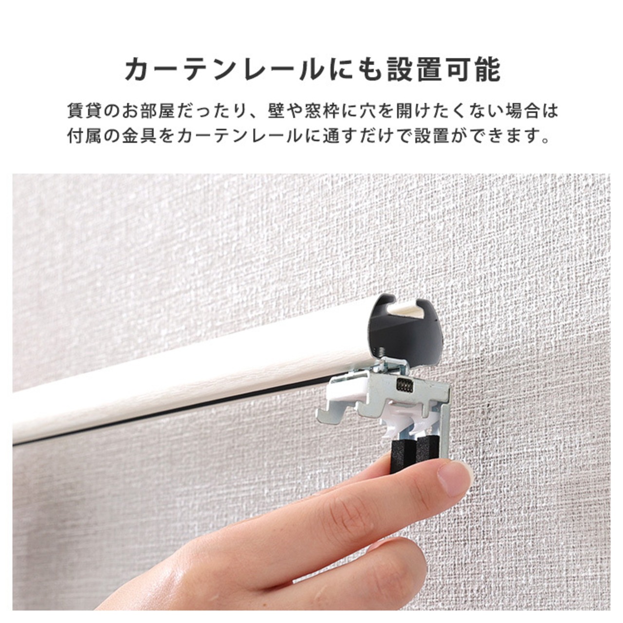 専用の金具でカーテンレールにも取り付けでき穴あけ不要なので賃貸でもご使用いただけます。