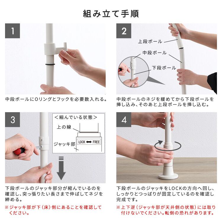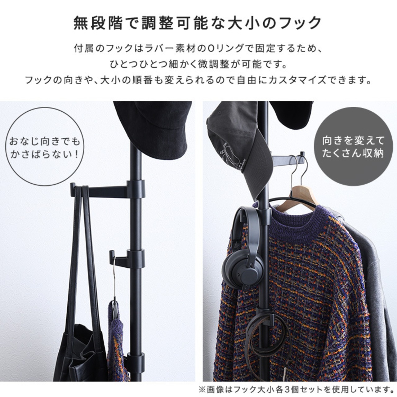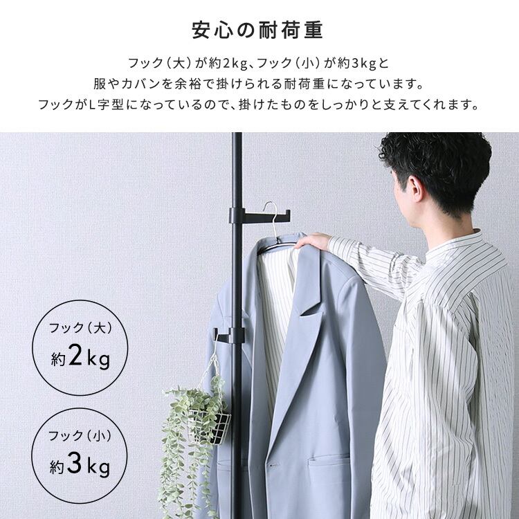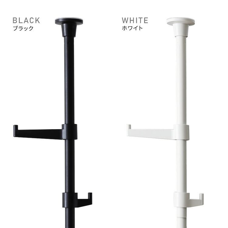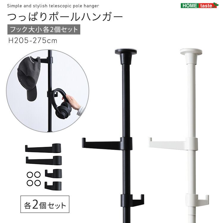 一本のつっぱりポールに、フック大×2個とフック小×2個がセットになっており、自在な高さ設定で、自分の好きな位置にセッティングする事が出来ます。