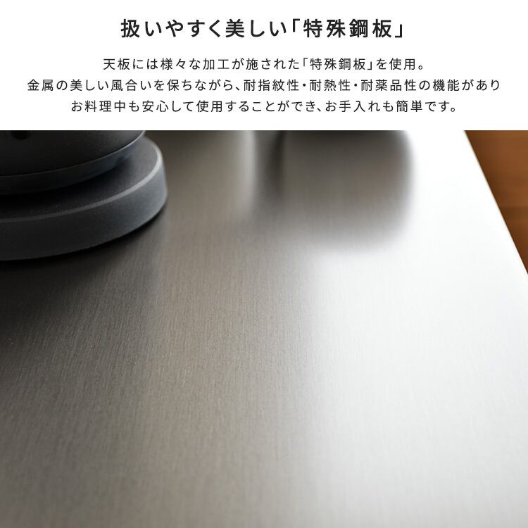 天板には特殊鋼板を使用しており、耐熱性はもちろん、指紋が付いたり薬品で傷ついたりするのを防ぎます。