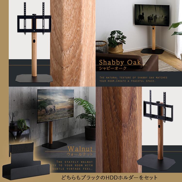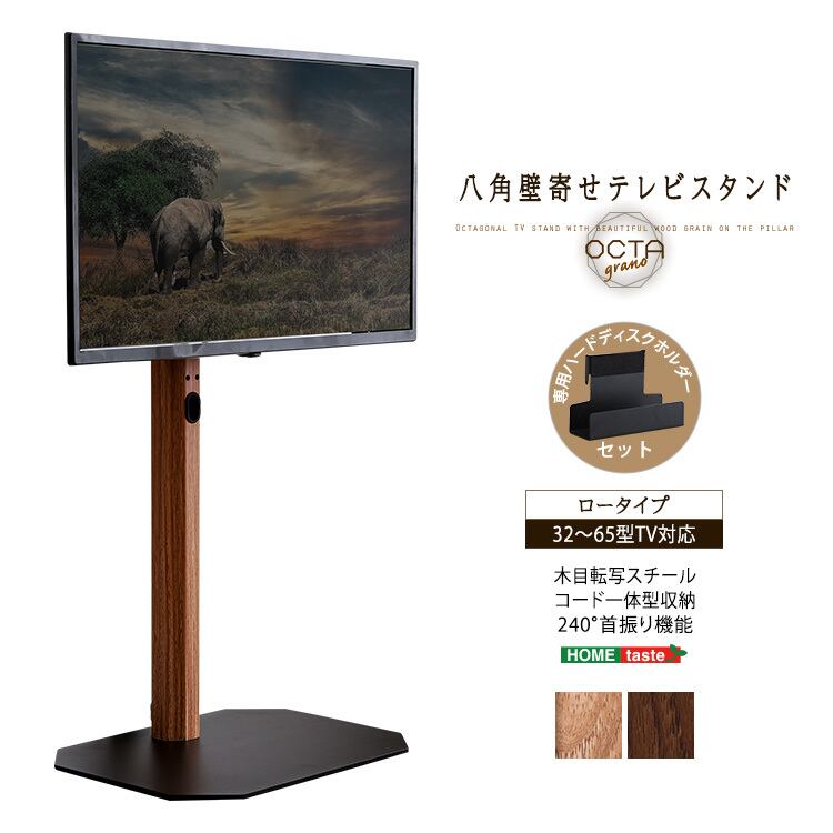 ヴィンテージカラー(ウォールナット、シャビーオーク)をスチール支柱に木目を転写したスタイリッシュなデザインの八角テレビスタンド ロータイプ ハードディスクホルダーセットです。