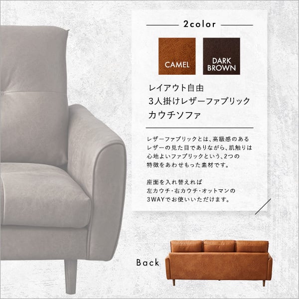 座面を入れ替えてレイアウト自由な3人掛けレザーファブリックカウチソファ!