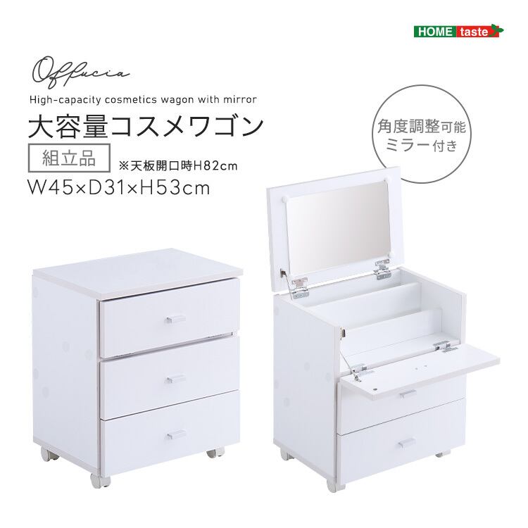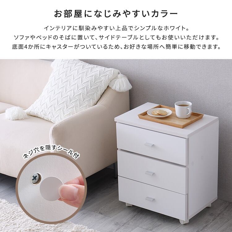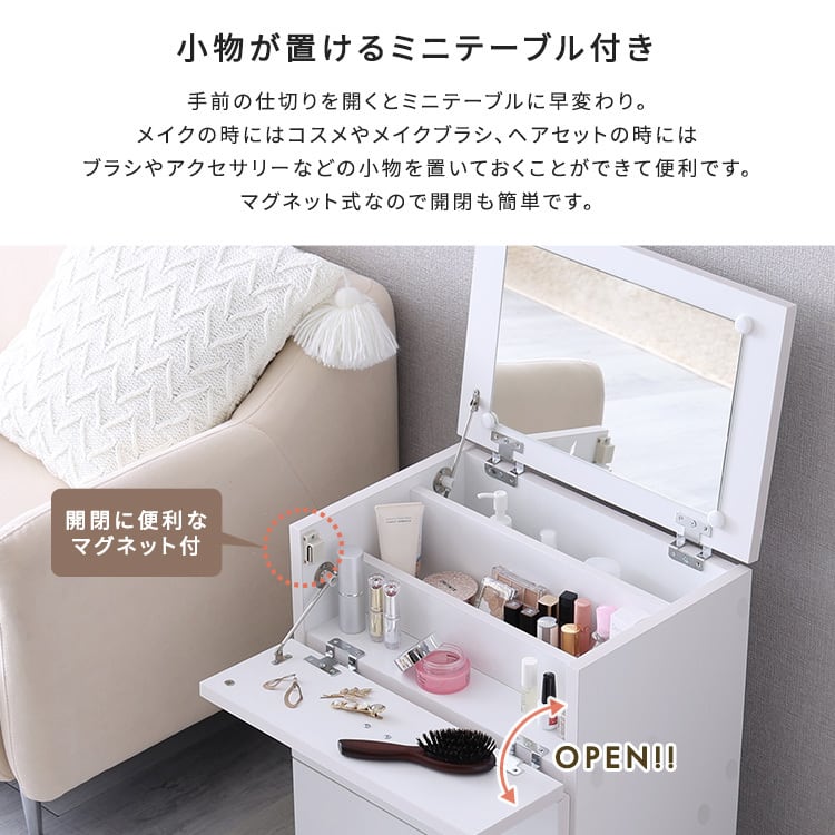 高さのあるスプレー類もしまえる深めの引き出しや、小物をしまうのに便利な2杯の引き出しつき。