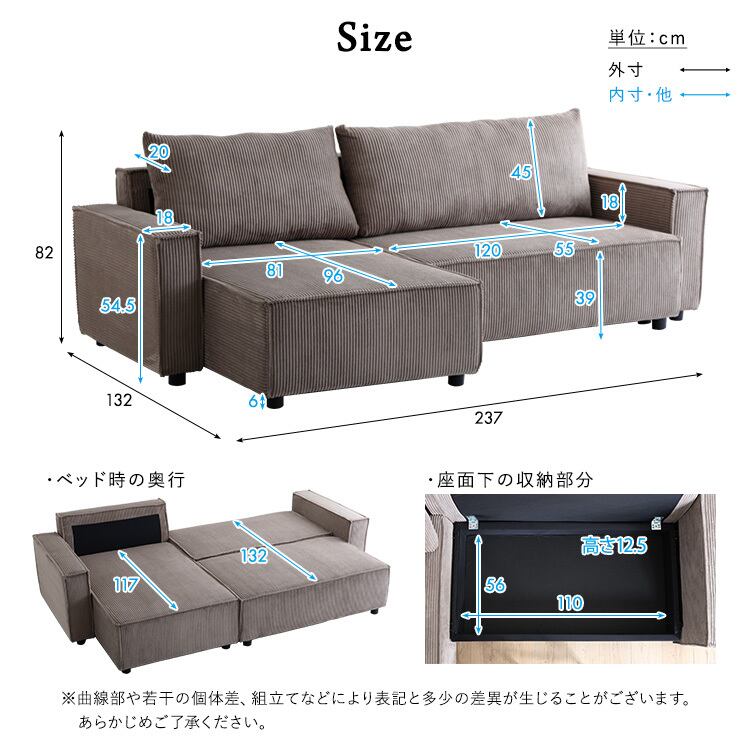 コーデュロイ生地の3人掛けカウチソファベッド!