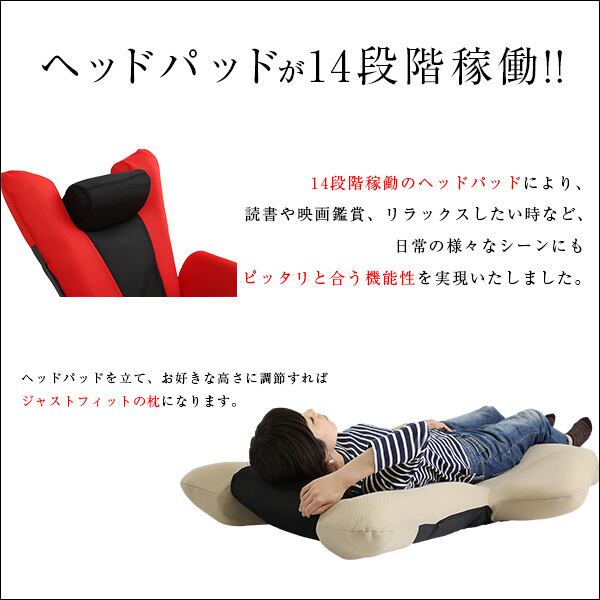 ヘッドパット・背もたれ・足乗せ・肘掛け左右が14段階のギア調節可能