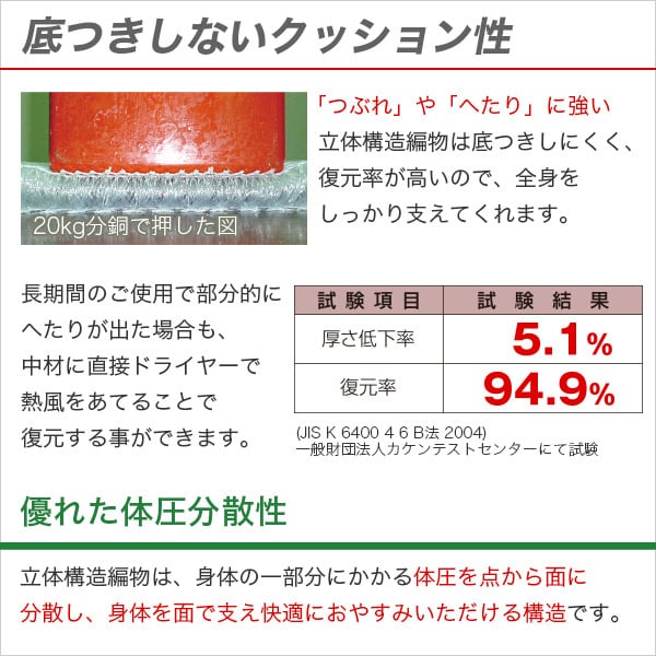 安心の日本製!クッション性、耐久性に優れた高反発のマットレスです!強力糸で支える立体構編物により底つき感を減らして全身を支えます!
