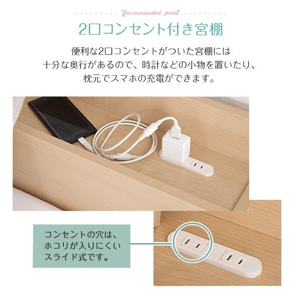 タブレットも立て掛けられる宮棚・2口コンセント付き!