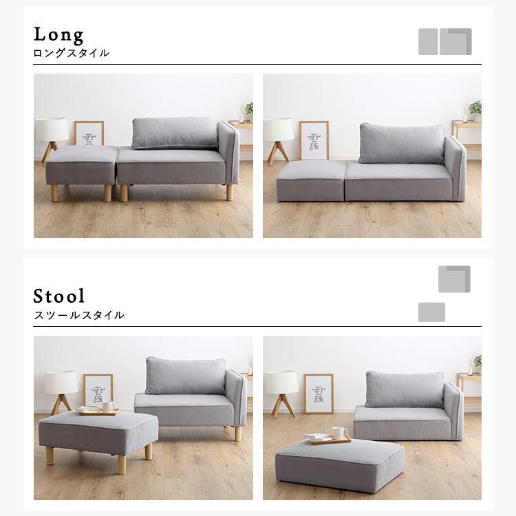 分割できるオットマンのセットで、お部屋のサイズやライフスタイルに合わせてレイアウト可能です。