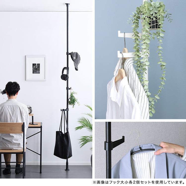 一本のつっぱりポールに、フック大×1個とフック小×1個がセットになっており、