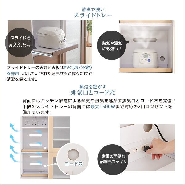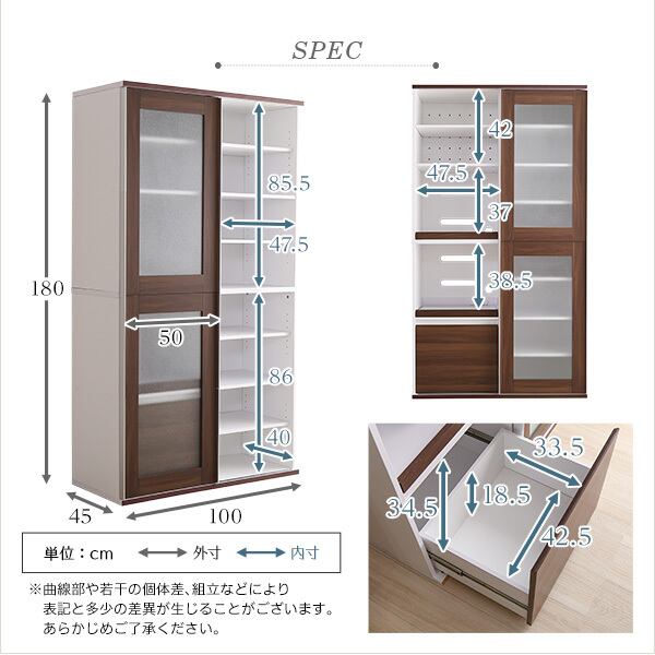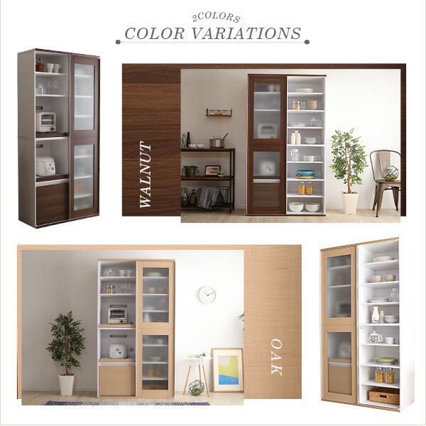 収納スペースを左右に分け、左側に家電収納棚やフルオープンの引出し右側に計8段の食器収棚を設けガラスのスライドドアで楽に開閉・切替が可能です。
