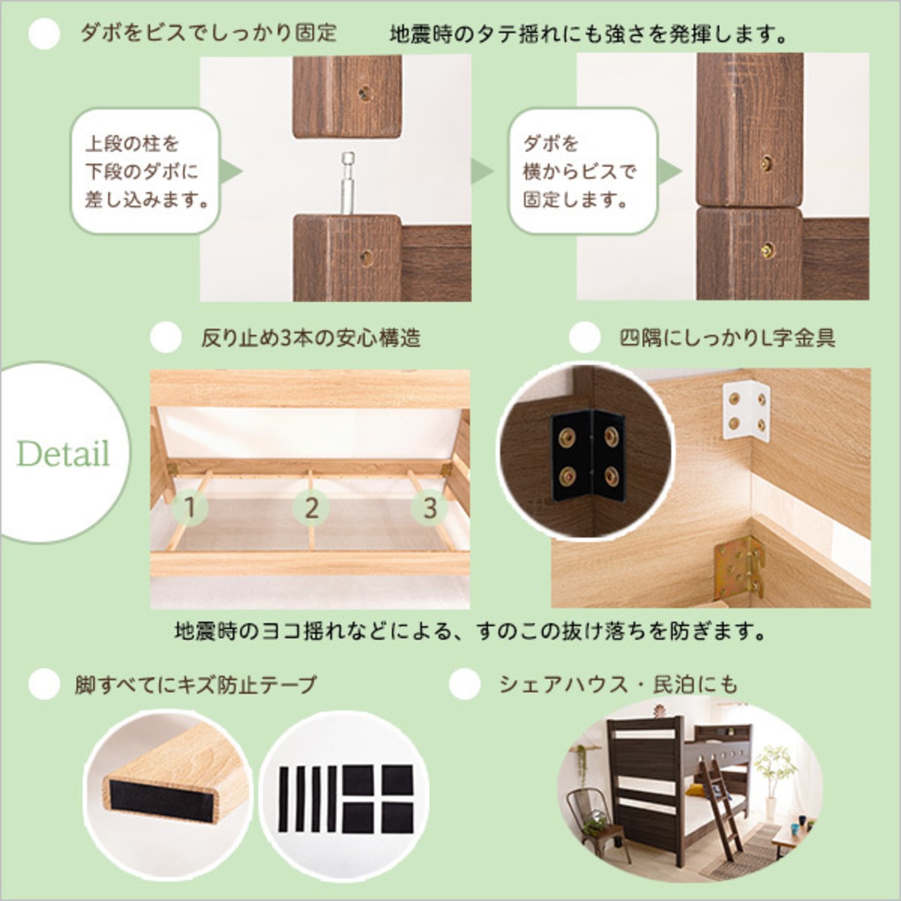 通気性のあるすのこ床を使用しており、すのこ下の反り止めを3本使用した安心構造。